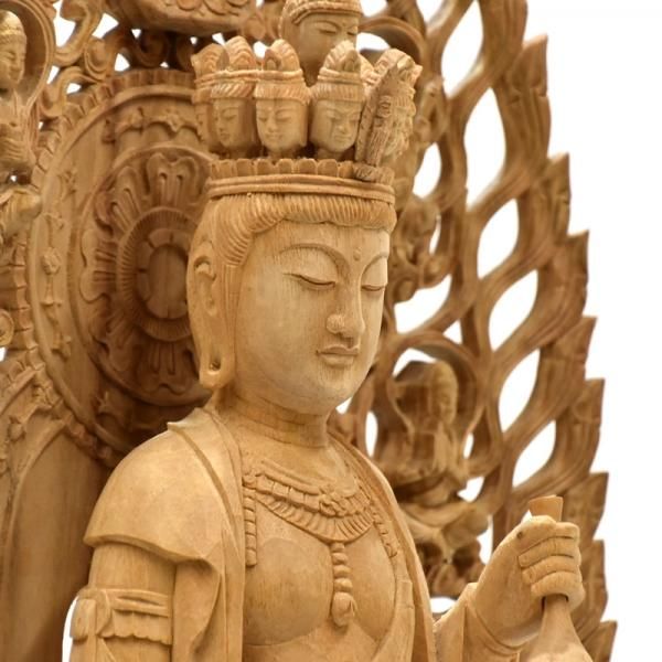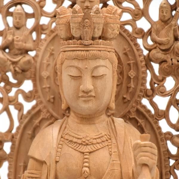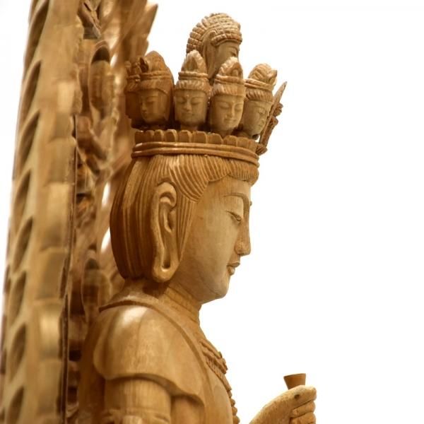 大光普照(だいこうふしょう)観音とも呼ばれ、頭上の11面のうち、前後左右の10面は菩薩修行の階位である十地を表し、最上部の仏面は仏果を表すとされるが、これは衆生の十一品類の無明煩悩を断ち、仏果を開かしめる功徳を表すとされる。「救わで止まんじ」の誓願を持つがゆえに、大悲闡提とも呼ばれる。六観音の役割では、阿修羅道の衆生を摂化するという。