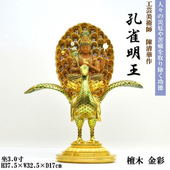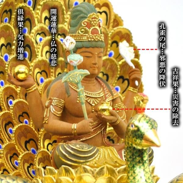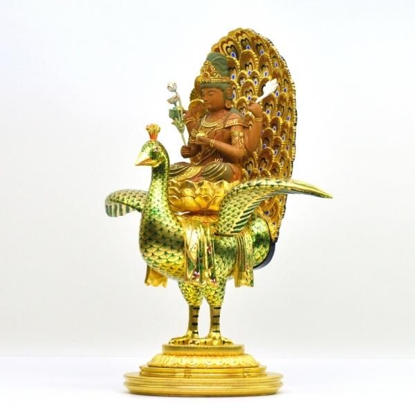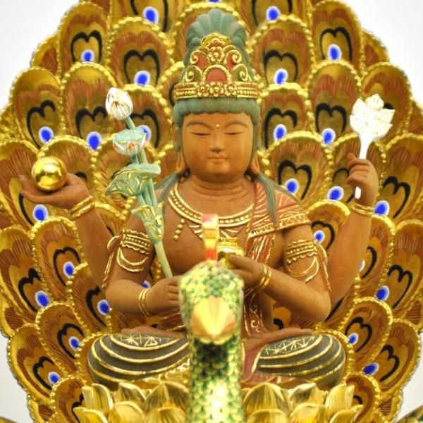孔雀明王は、仏教の信仰対象であり、密教特有の尊格である明王のひとつ。 衆生を利益する徳を表すとされる。孔雀仏母、孔雀王母菩薩、金色孔雀王とも呼ばれる。憤怒の相が特徴である明王のなかで唯一、慈悲を表した菩薩形をもつ。孔雀の上に乗り、一面四臂の姿で表されることが多い。4本の手にはそれぞれ倶縁果、吉祥果、蓮華、孔雀の尾を持つ。
