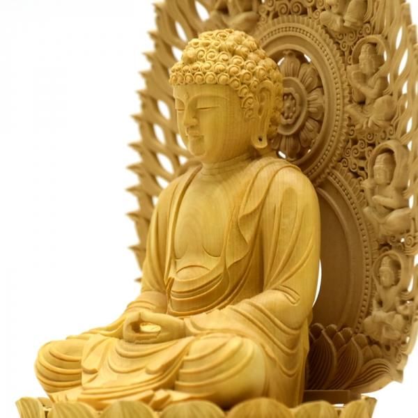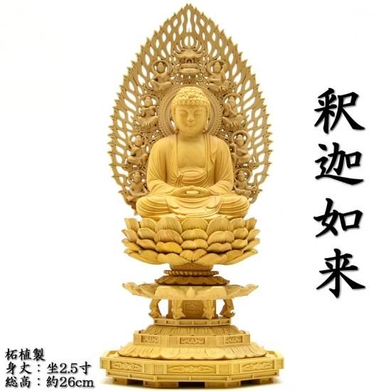 釈迦如来は仏教の開祖で、実在の人物であった釈迦を他の如来と同列にとらえたものであるが、その生涯の仏伝に対応してさまざまな像が造られている点は特徴的である。一般的な釈迦如来像は、施無畏・与願印、法界定印を結ぶものが多く、時に説法形の転法輪印が見られる。単独像以外に三尊も造られ、その折は獅子に乗る文殊と象に乗る普賢の両菩薩を脇侍とするものが多い。