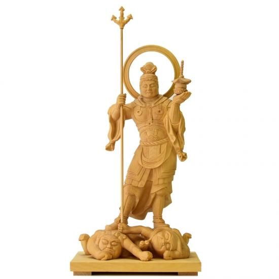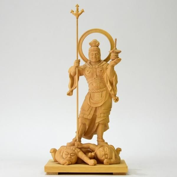 その姿には様々な表現があるが、日本では一般に革製の甲冑を身に着けた唐代の武将風の姿で表される。持物は宝塔が一般的です。また、邪鬼と呼ばれる鬼形の者の上に乗ることが多い。ただし、東大寺戒壇堂の四天王像では右手に宝塔を捧げ持ち、左手で宝棒を握る姿で造像されています。