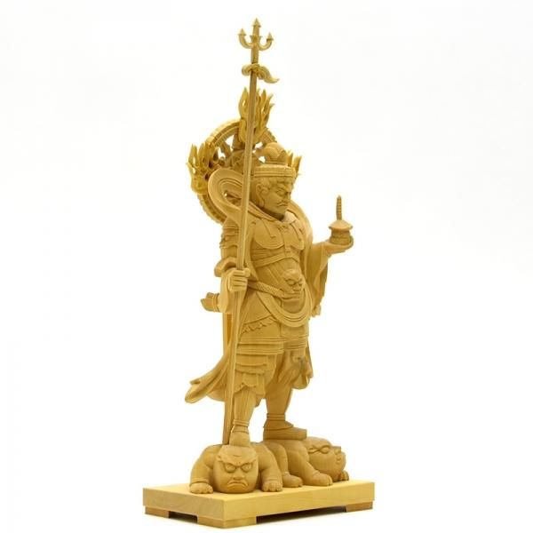 その姿には様々な表現があるが、日本では一般に革製の甲冑を身に着けた唐代の武将風の姿で表される。持物は宝塔が一般的です。また、邪鬼と呼ばれる鬼形の者の上に乗ることが多い。ただし、東大寺戒壇堂の四天王像では右手に宝塔を捧げ持ち、左手で宝棒を握る姿で造像されています。