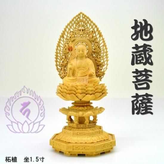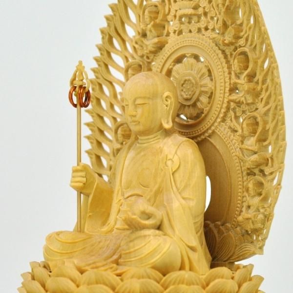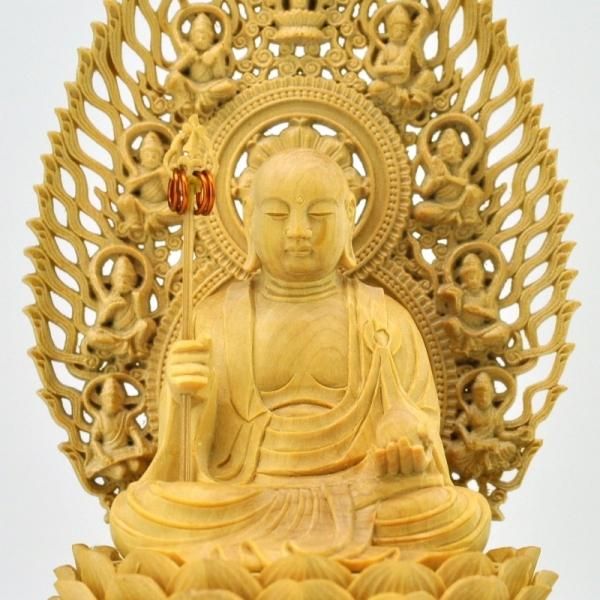 主な役目は、地獄・餓飢・畜生・修羅・人間・天上の六道を輪廻転生しながら、苦しむ人々を救うことです。頭を丸めた僧の姿をし、右手には六道を巡っている象徴である錫杖、左手にはどんな願いでも叶える如意宝珠を持っています。