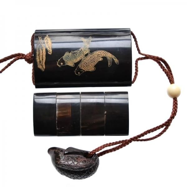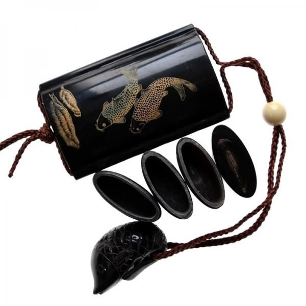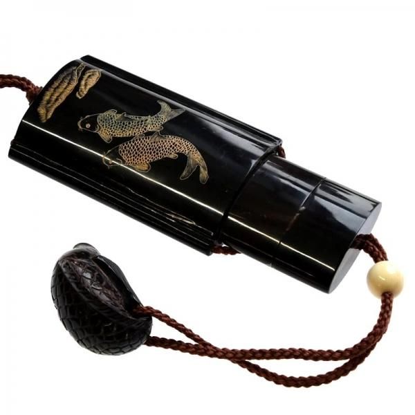 【印籠(いんろう)】 水戸黄門などでおなじみの印籠は、戦国時代に武士が携帯用薬入れとして戦陣で用いるようになったものが現在の原型と伝えられています。江戸時代になって、町人も持ち歩くようになりました。中に薬など、常備するものを入れていたそうです。侍の正装に印籠は欠かせないものだったらしく、現代では本来の用途とは別に、衣装に凝った瀟洒なもの、恵比須・大黒・鯉(恋)などを彫り込んだ縁起物として作られるようになりました。