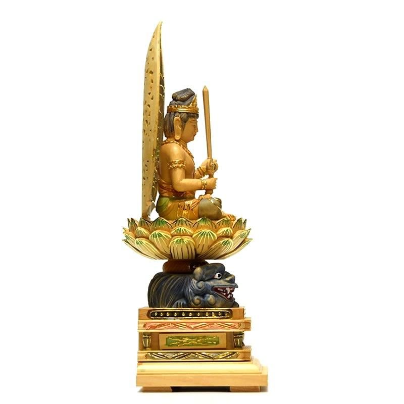 文殊菩薩の姿は獅子の背上の蓮華座に坐して、右手に剣、左手に経典を持つのがごく一般的です。獅子は智慧の勢いが盛んなことを表し、剣は智恵が研ぎ澄まされていることを、経典は智慧そのものの象徴となっています。獅子に乗らない姿もあります。