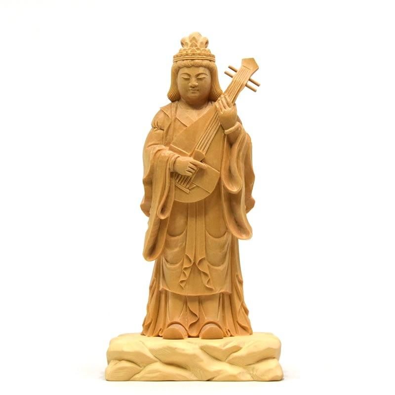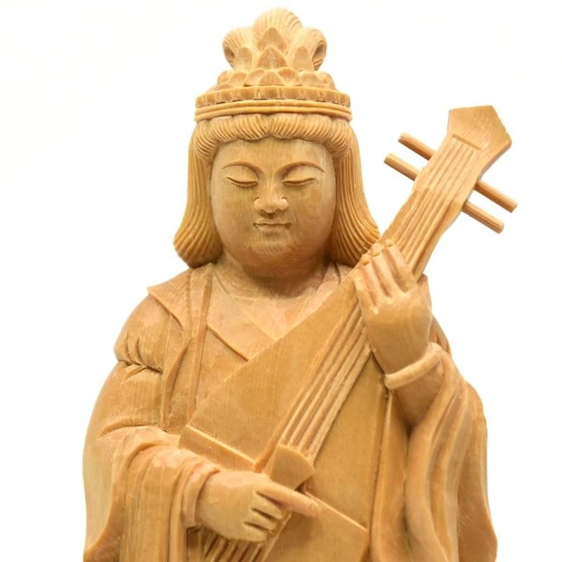一般的に馴染み深いのは、一つの顔に2本の手で、音楽の神の象徴である琵琶を弾き、足を崩して座っている姿です。これに対して、8本の手があり、それぞれに金剛杵、剣、斧、弓などの武器を持つ八臂弁財天像も少なくありません。