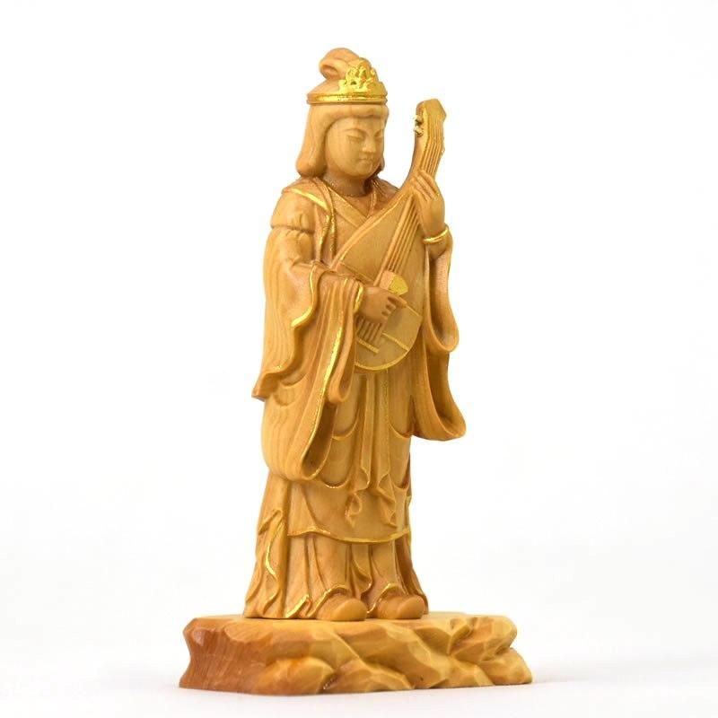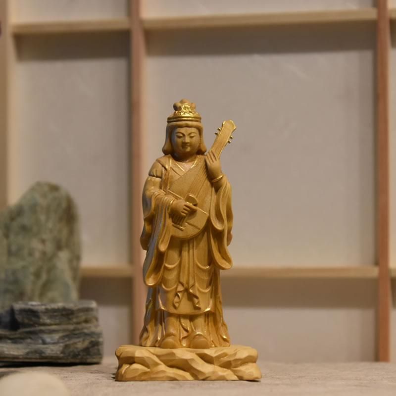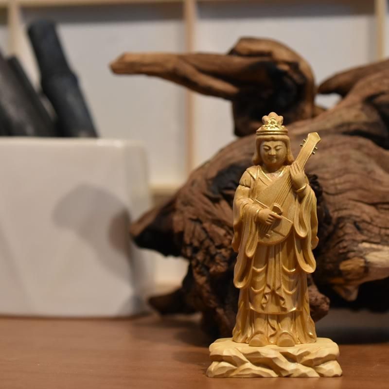 一般的に馴染み深いのは、一つの顔に2本の手で、音楽の神の象徴である琵琶を弾き、足を崩して座っている姿です。これに対して、8本の手があり、それぞれに金剛杵、剣、斧、弓などの武器を持つ八臂弁財天像も少なくありません。