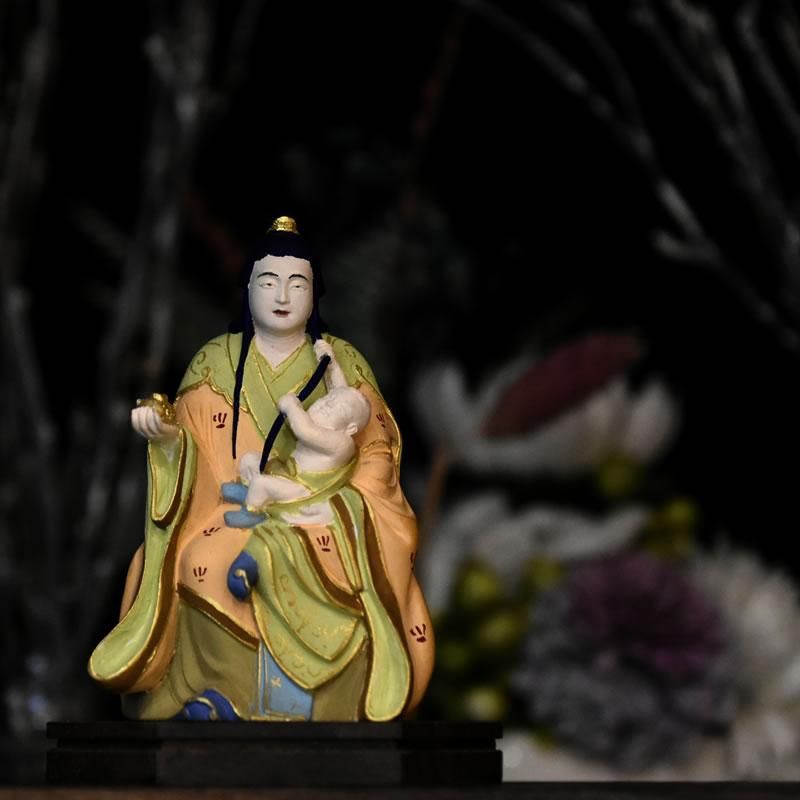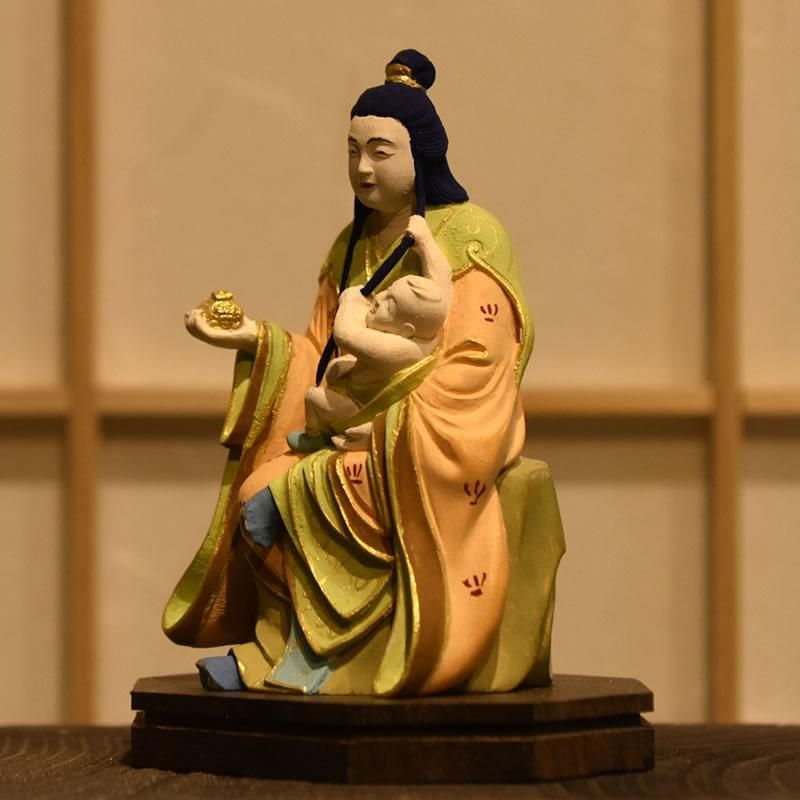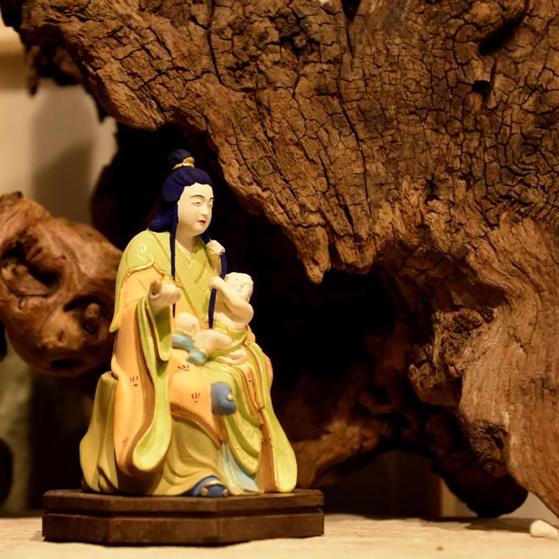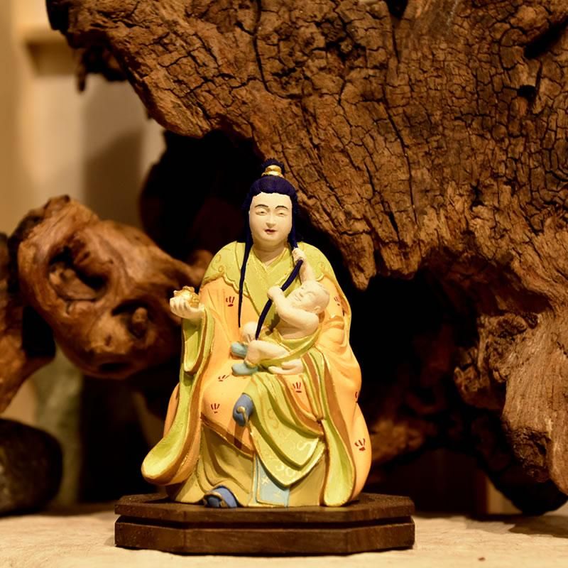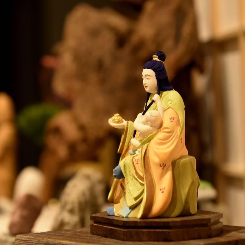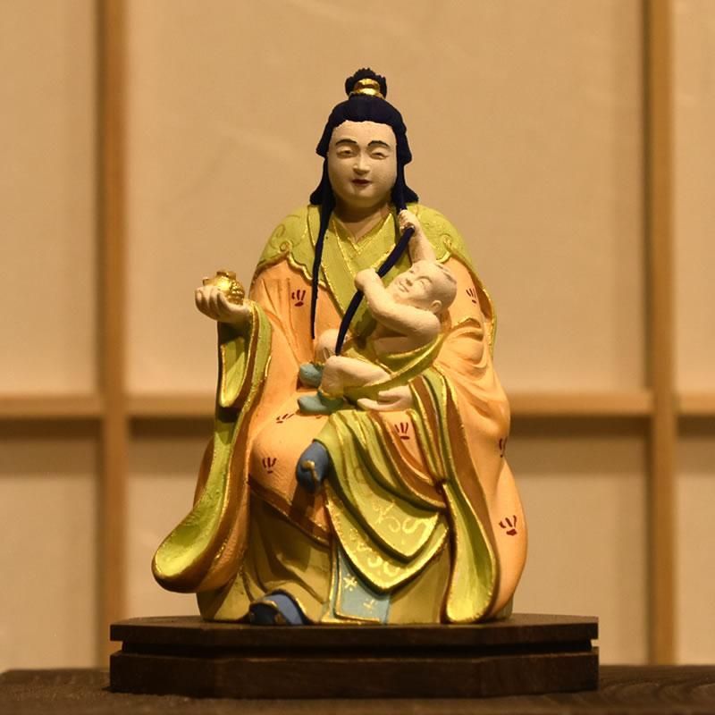 鬼子母神(きしもじん/きしもしん)は仏教を守護するとされる夜叉で女神の一尊。インド出身の鬼子母神は、初めハーリティ(訶梨帝母(かりていも))といい、他人の子供を奪って食べてしまう鬼神でしたが、お釈迦さまが彼女が一番可愛がっている末子を隠して、子を失う母の悲しみを諭しました。これより、訶梨帝母は仏教に帰依して、子供の守り神となった。鬼子母神のお姿には、鬼形、天女形があり、総髪合掌のお姿。お顔に威厳があり何者をも威圧する気迫がなくてはならない。また合掌の姿は成仏の合掌と祈祷の合掌形があるので祈祷の形にした。