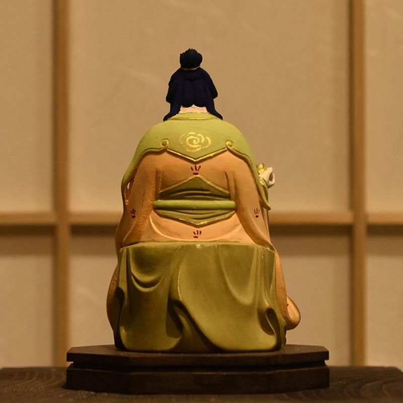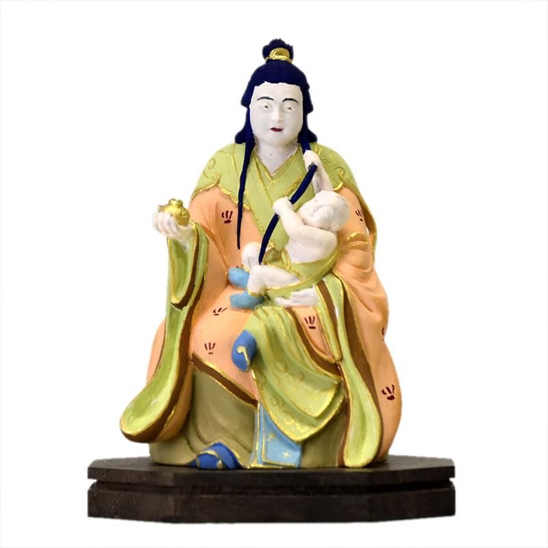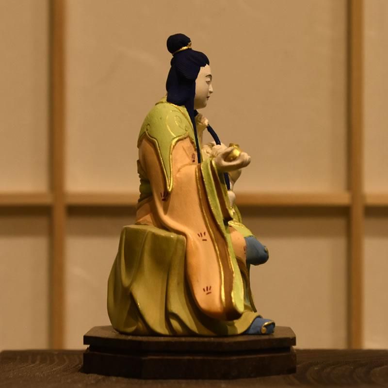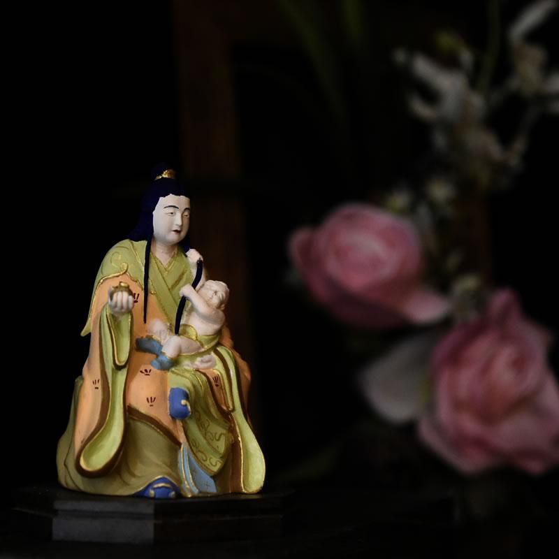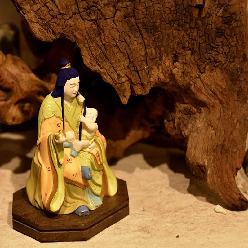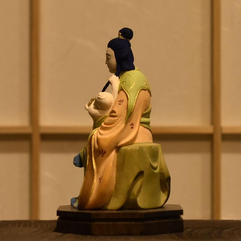 鬼子母神(きしもじん/きしもしん)は仏教を守護するとされる夜叉で女神の一尊。インド出身の鬼子母神は、初めハーリティ(訶梨帝母(かりていも))といい、他人の子供を奪って食べてしまう鬼神でしたが、お釈迦さまが彼女が一番可愛がっている末子を隠して、子を失う母の悲しみを諭しました。これより、訶梨帝母は仏教に帰依して、子供の守り神となった。鬼子母神のお姿には、鬼形、天女形があり、総髪合掌のお姿。お顔に威厳があり何者をも威圧する気迫がなくてはならない。また合掌の姿は成仏の合掌と祈祷の合掌形があるので祈祷の形にした。