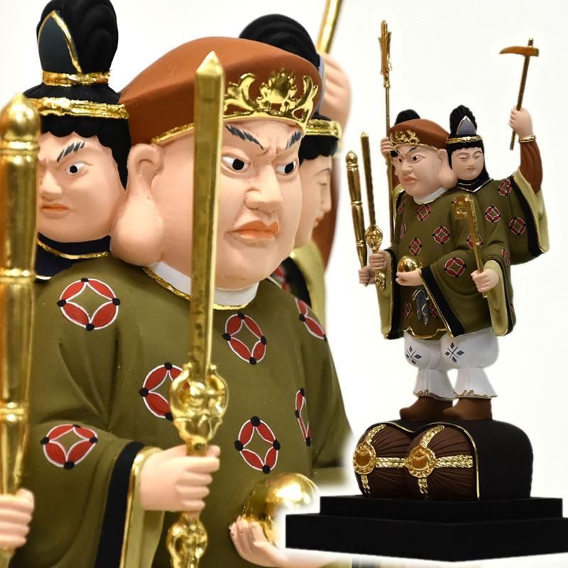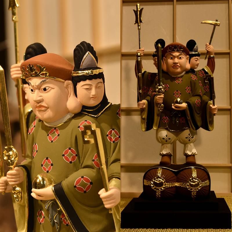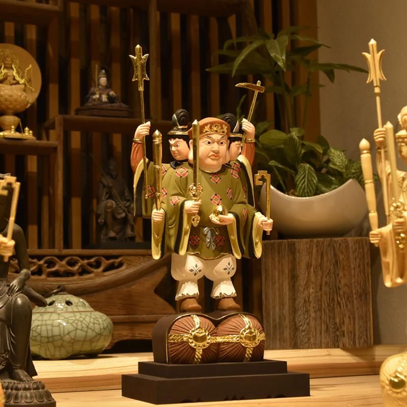 三面大黒天は富と福の大黒天に武力の毘沙門天、才能と美貌の弁才天の三徳合体像です。子孫繁栄・福徳智慧・金運・商売繁盛(千客万来)、人脈形成、出世など現世利益抜群のご利益がある。