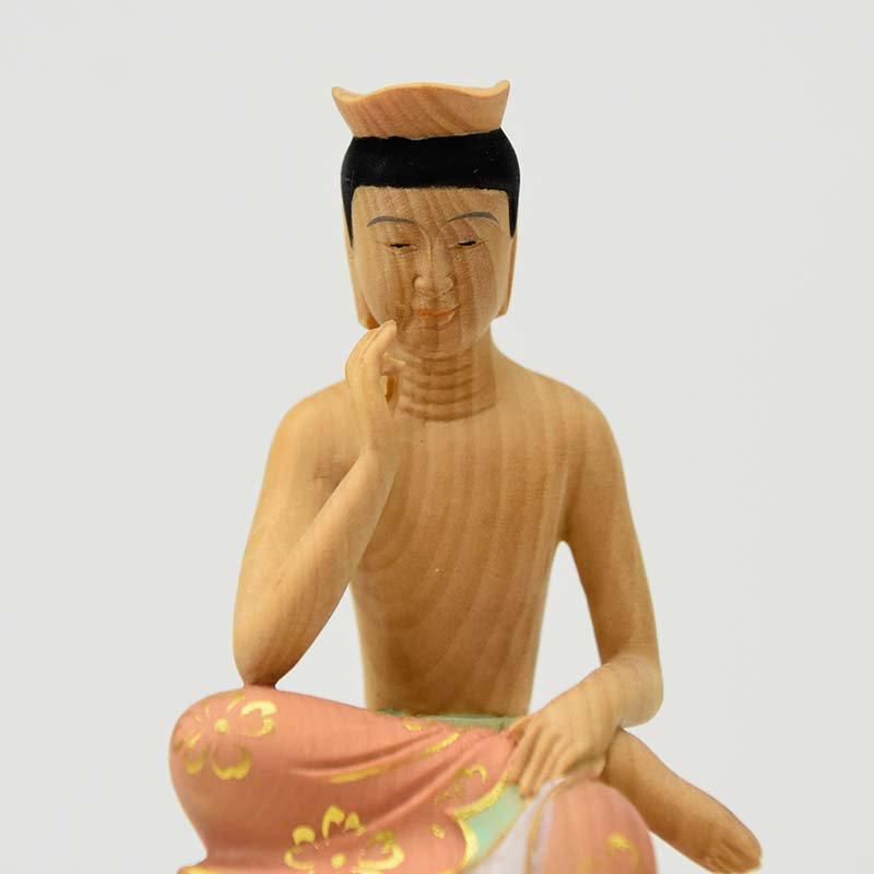 弥勒菩薩は、サンスクリット語で「慈悲から生まれたもの」という意味で、「慈氏弥勒」ともいわれます。広隆寺と中宮寺の半跏思惟像があまりにも有名なので、弥勒菩薩はすべて頬づえをつく姿だと思われていますが、実は印の組み方も姿もいろいろなものがあります。宝冠をかぶり、結跏趺坐して定印に組んだ掌の上に宝塔を置いている像も少なくありません。釈迦から、「悟りを開いて次の仏になるのは弥勒菩薩だ」と告げられ、釈迦入滅後56億年7千万年後に現れて人々を救うとされている菩薩で、「未来仏」として信仰を集めってきました。