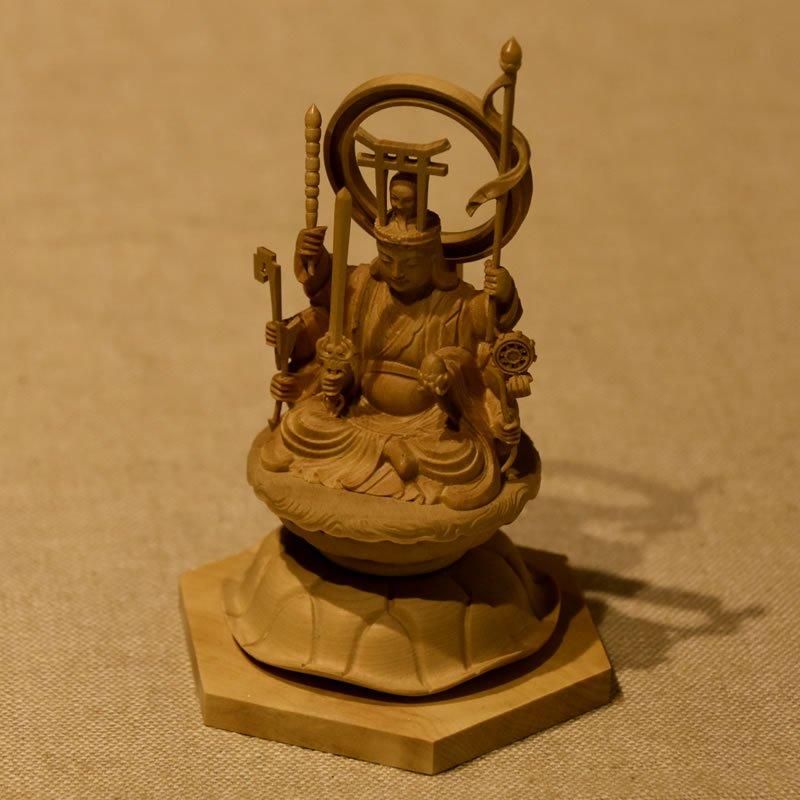 一般的に馴染み深いのは、一つの顔に2本の手で、音楽の神の象徴である琵琶を弾き、足を崩して座っている姿です。これに対して、8本の手があり、それぞれに金剛杵、剣、斧、弓などの武器を持つ八臂弁財天像も少なくありません。